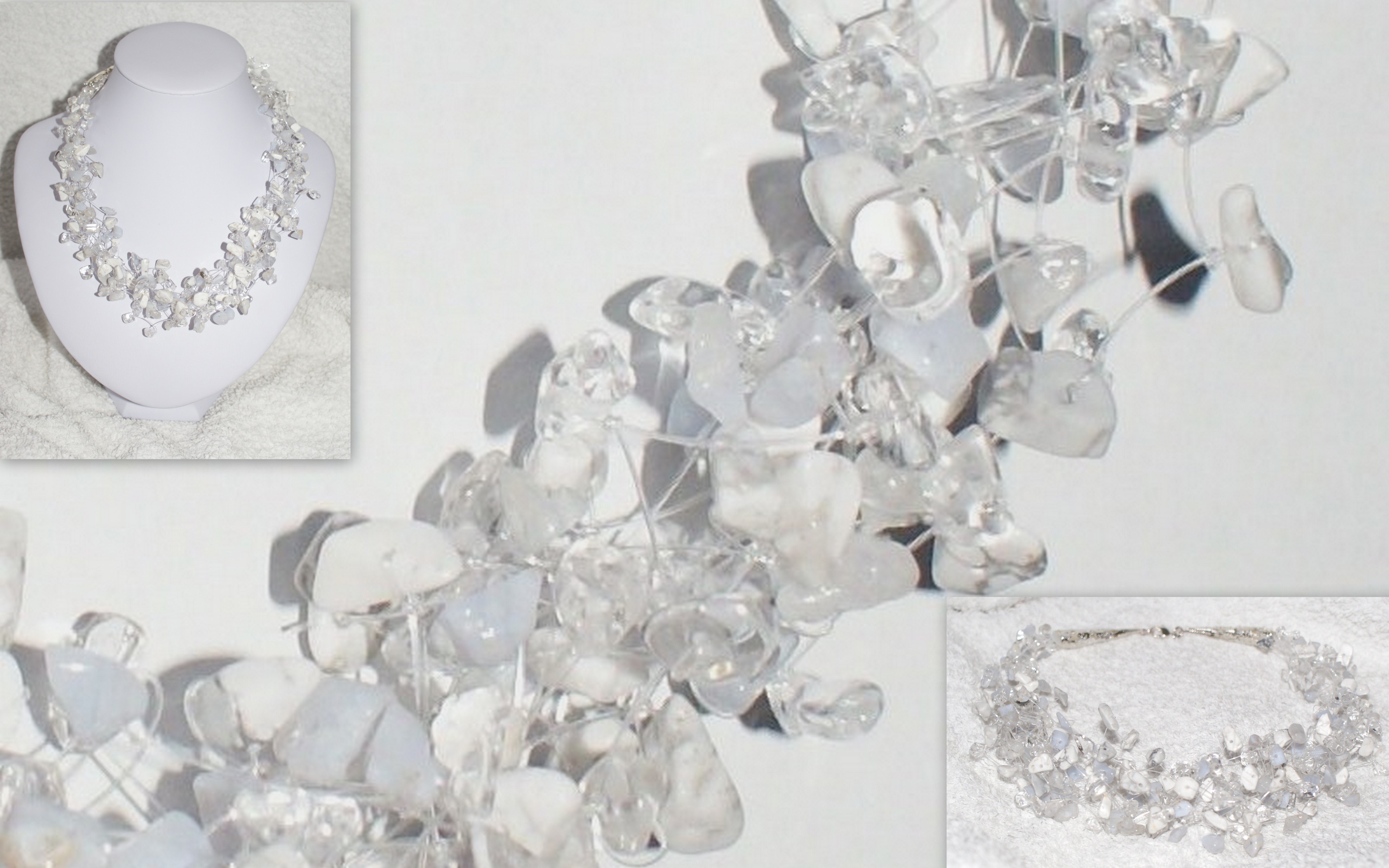 De ketting bestaat uit tien strengen geknoopte edelsteentjes, Bergkristal, howliet en chalcedoon. Deze vertegenwoordigen het ijs, de sneeuw en de ijle blauwe lucht die je in de winter vaak ziet.