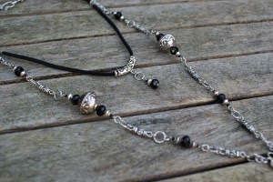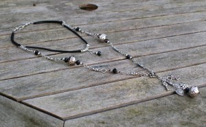 Zwarte facetkralen, metalen kralen, connectors en bedels en zwart suéde veter. Ik heb hiermee de eerste plaats behaald.
