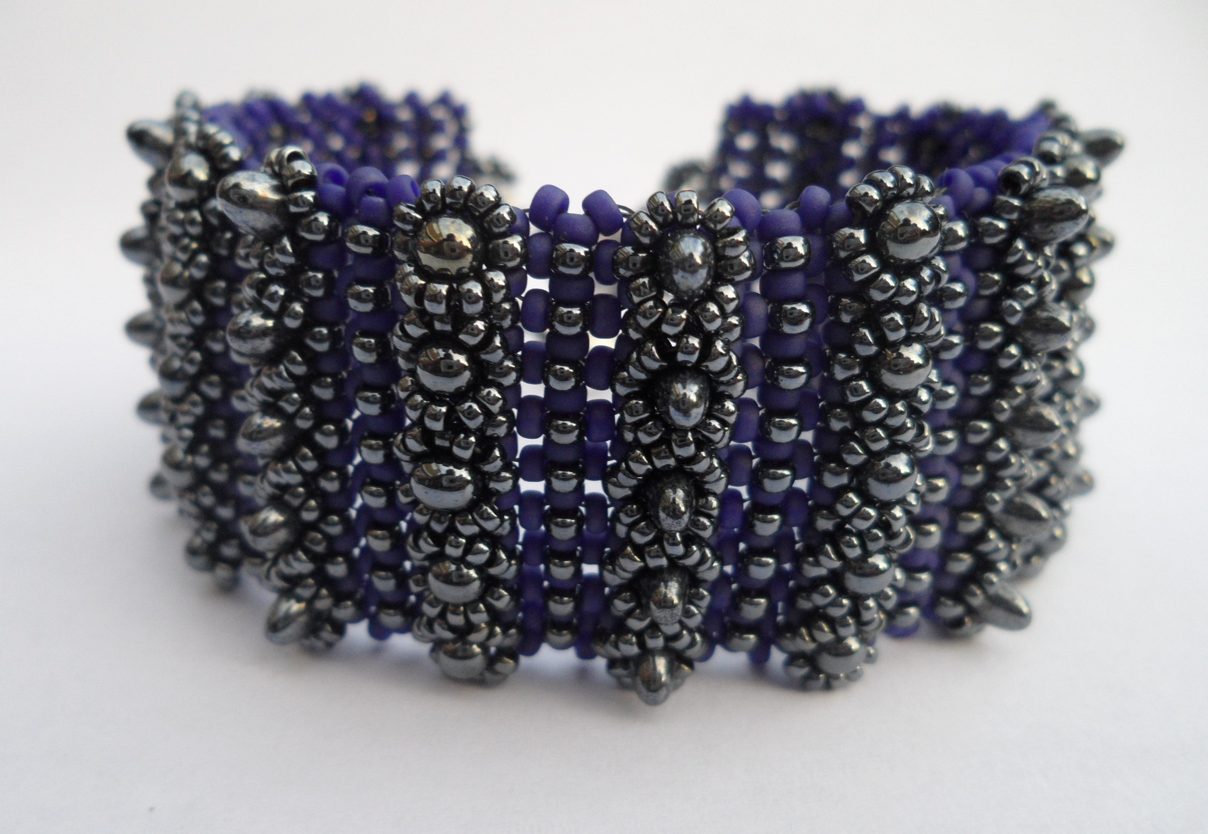 Gemaakt met Miyuki rocailles opaque matte cobalt met als accent gunmetal metalic matte.