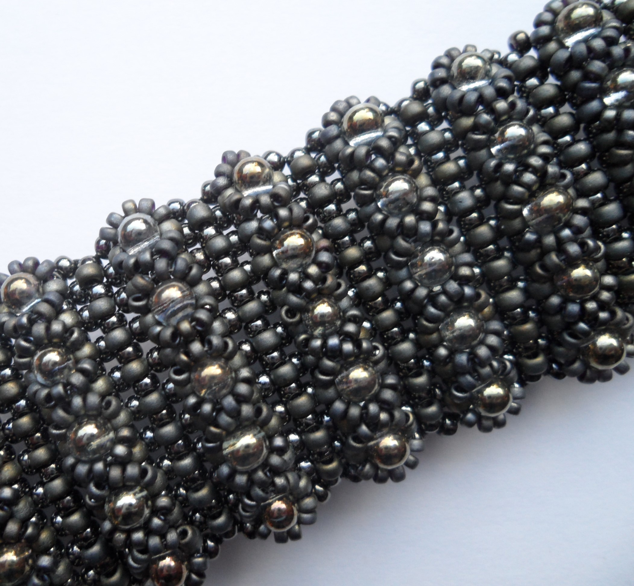 Metalic matte silvergray en light gunmetal rocaille, transparant silvergray gold luster drops. Lengte 17cm met schuifslot.  Privé bezit.
